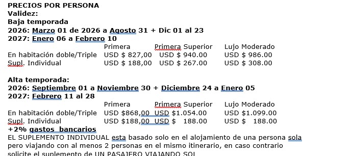 Es responsabilidad de cada viajero, ir provisto de su pasaporte y documento de identidad preciso, vigente y dotado de todos los visados y requisitos necesarios, declinando las agencias prestatarias de servicios y operadores, toda responsabilidad, en el caso de ser rechazada por alguna autoridad la entrada en un País, por carecer de algunos de los requisitos que se precisen o defecto en el pasaporte, y será por cuenta del viajero cualquier gasto que se origine, aplicándose en estas circunstancias las condiciones establecidas para la cancelación y rechazo voluntario de los servicios.