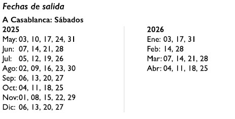 Desayuno. A la hora indicada traslado al aeropuerto de Marrakech o Casablanca para embarcar en el vuelo de salida.