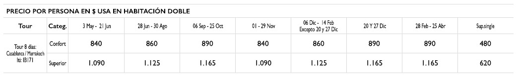 • 8 Días: Casablanca / Marrakech o Casablanca: 210$ Incluye 5 Almuerzos