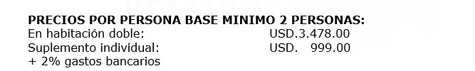 SERA RESPONSABILIDAD DEL VIAJERO Y SU AGENCIA DE VIAJES CUMPLIMENTAR TODOS LOS REQUERIMIENTOS SANITARIOS REQUERIDOS PARA ESTE VIAJE YA SEA EN EL PAIS DE DESTINO COMO PAIS DE CONEXION (SI CORRESPONDE). VIAJES CELTOUR DARA INFORMACION BASICA GENERAL ANTICIPADA PERO TENIENDO EN CUENTA LOS CAMBIOS FRECUENTES DE LAS CONDICIONES DE ENTRADA DEBERAN SER CONSULTADAS CONSTANTEMENTE POR PARTE DEL VIAJERO DIAS ANTES DE LA SALIDA