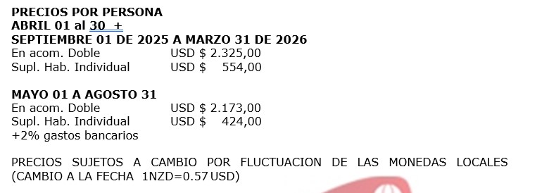 La organización de estos viajes combinados ha sido realizado por VIAJES CELTOUR operador mayorista con Registro Nacional de Turismo 3487, y/o sus operadores locales, se hace responsable ante los usuarios por la total prestación de servicios descritos en el presente folleto