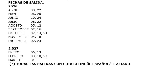 La organización de estos viajes combinados ha sido realizado por VIAJES CELTOUR operador mayorista con Registro Nacional de Turismo 3487, y/o sus operadores locales, se hace responsable ante los usuarios por la total prestación de servicios descritos en el presente folleto