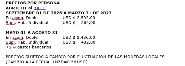 – En general ningún servicio que no este claramente estipulado en el presente itinerario