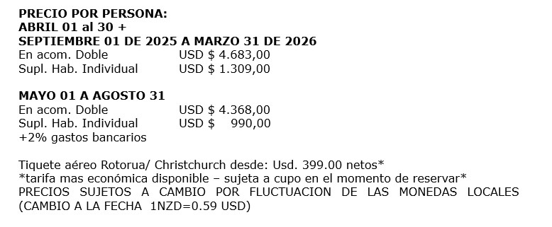 Al mencionar Nueva Zelanda viene a nuestra mente imágenes de un marco natural extraordinario que ha sido utilizado en los últimos años para la realización de películas que han aprovechado los contrastes que se pueden encontrar en estas dos pequeñas islas, además la cultura Maorí sigue latente en este país por lo que un recorrido de 9 días le permitirá disfrutarlo de primera mano a la vez que disfruta de magníficos escenarios