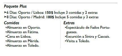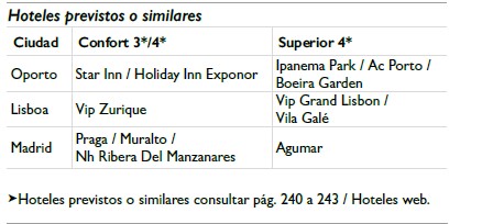 Comidas: Almuerzo en Oporto. Almuerzo en Fátima. Cena en Lisboa. Almuerzo en Mérida. Almuerzo en Toledo.