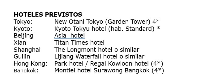 Alojamiento en hoteles primera categoría en habitaciones estándar en Japón, Bangkok y Hong Kong; Lujo moderado en China.