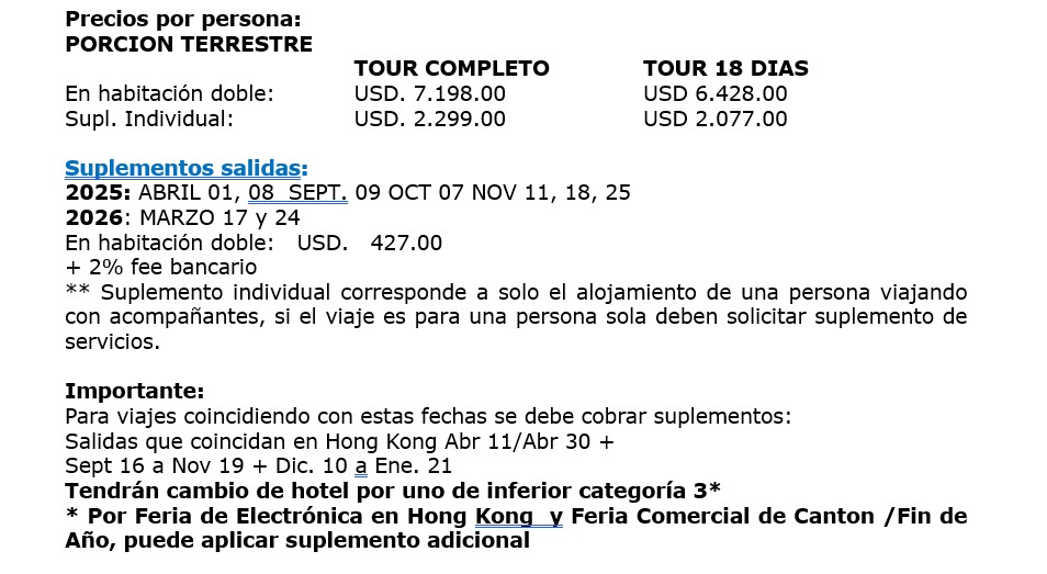 Los servicios en el Medio y Lejano Oriente manejan condiciones especiales de reservas y cancelaciones, los hoteles, guías y medios de transporte se contratan y se pagan con una anticipación de 45 días antes de la llegada de los pasajeros a destino. Posterior al pago NO SON REEMBOLSABLES por ningún motivo por lo que cualquier servicio que dentro de este margen de tiempo sea modificado, cancelado o no tomado no da derecho a ningún tipo de reembolso