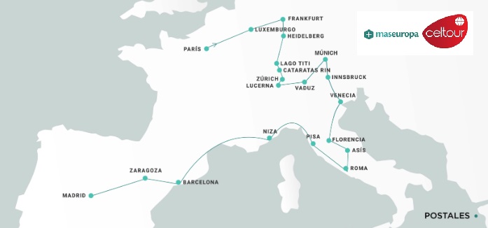 París – Luxemburgo – Rin – Frankfurt – Heidelberg – Selva Negra – Zúrich – Lucerna – Vaduz – Múnich – Innsbruck – Verona – Venecia – Florencia – Asís – Roma – Pisa – Niza – Barcelona – Zaragoza – Madrid