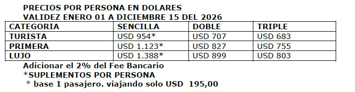 IMPORTANTE: Es responsabilidad de cada viajero, ir provisto de su pasaporte y documento de identidad preciso, vigente y dotado de todos los visados y requisitos necesarios, declinando las agencias prestatarias de servicios y operadores, toda responsabilidad, en el caso de ser rechazada por alguna autoridad la entrada en un País, por carecer de algunos de los requisitos que se precisen o defecto en el pasaporte, y será por cuenta del viajero cualquier gasto que se origine, aplicándose en estas circunstancias las condiciones establecidas para la cancelación y rechazo voluntario de los servicios.