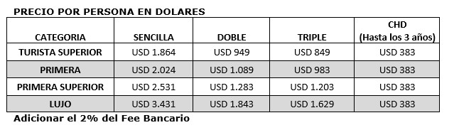 DEPOSITO: Para realizar reservas en firme se requiere un depósito del 30% del valor total de la cotización por persona y cuyo valor será abonado al pago total.