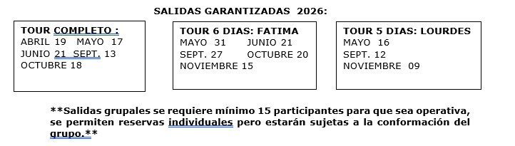 de lo contrario los participantes del tour podrán asistir a las misas establecidas en los diferentes santuarios y en los idiomas que se promulguen.