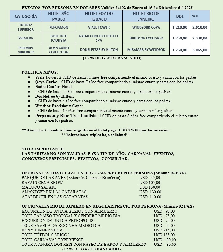 **Se recomienda vuelos a Foz do Iguaçu llegando antes de las 12:00 o saliendo después de las 16:00**