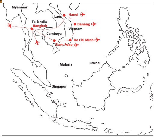 Vietnam, país casi reconstruido después de la guerra con los Americanos por Alemanes y Franceses lo que le ha dado a muchas de sus ciudades un ambiente único por la mezcla de tradiciones locales y extranjeras y Cambodia un pequeño país que gracias al descubrimiento arqueológico mas increible del ultimo tiempo la ha colocado en un sitio de obligatoria de visitarlo metido en medio de la selva, todo este y mucho mas en un solo viaje.