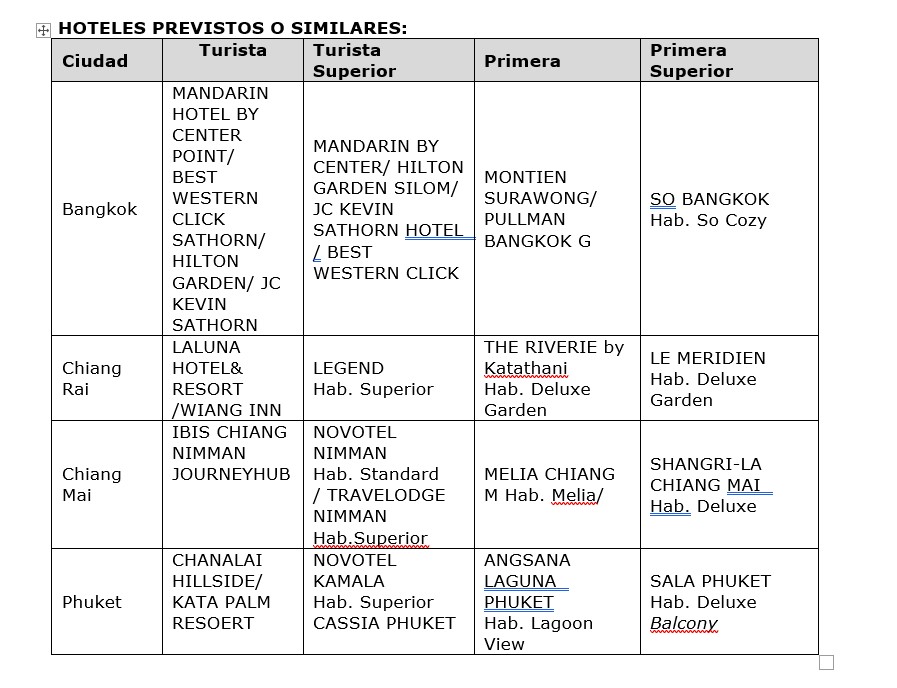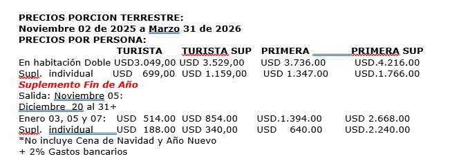 En general ningún servicio que no esté claramente estipulado en el presente itinerario