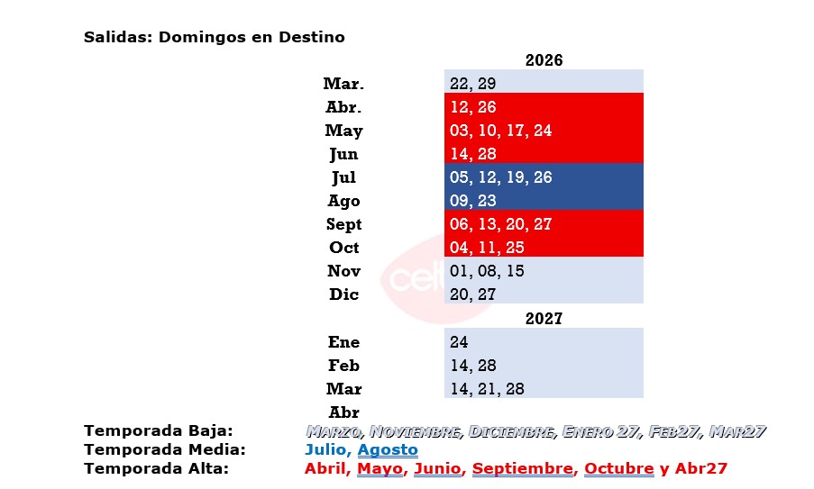 SERA RESPONSABILIDAD DEL VIAJERO Y SU AGENCIA DE VIAJES CUMPLIMENTAR TODOS LOS REQUERIMIENTOS SANITARIOS REQUERIDOS PARA ESTE VIAJE YA SEA EN EL PAIS DE DESTINO COMO PAIS DE CONEXION (SI CORRESPONDE). VIAJES CELTOUR DARA INFORMACION BASICA GENERAL ANTICIPADA PERO TENIENDO EN CUENTA LOS CAMBIOS FRECUENTES DE LAS CONDICIONES DE ENTRADA DEBERAN SER CONSULTADAS CONSTANTEMENTE POR PARTE DEL VIAJERO DIAS ANTES DE LA SALIDA
