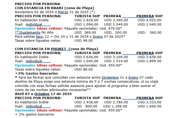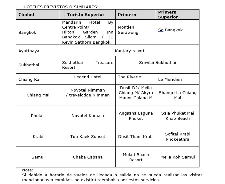 Pensar en un viaje completo a Tailandia es un reto ya que este país ofrece una gran cantidad de posibilidades al viajero, en este paquete ofrecemos una combinación perfecta de ciudades únicas como Bangkok donde podra visitar los mercados callejeros, ver sus palacios y recorrer opcionalmente el río la principal arteria de la ciudad, luego un recorrido en autobús hacia el Norte del pais, durante la travesia visitaremos pueblos llenos de historia y religiosidad, ya en el Norte veremos templos increibles y podremos disfrutar de una mañana con los nobles elefantes  en sus santuarios y finalizamos con una estancia en zona de Playa algunas reconocidas como las mejores del mundo… todo en un solo viaje