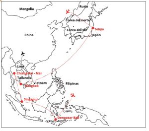 • Tiquetes aéreos internos de acuerdo al corte seleccionado, en el tour completo incluimos vuelos: Tokyo/ Bangkok/Chiang Rai/Samui/Singapur/Denpasar Bali clase turista con derecho a 15 kilos de equipaje en bodega en vuelos nacionales y 20 kilos en vuelos Internacionales, en aerolíneas de bajo costo (tarifa para compra 30 días antes del viaje *aplica suplemento por reservas de ultima hora).