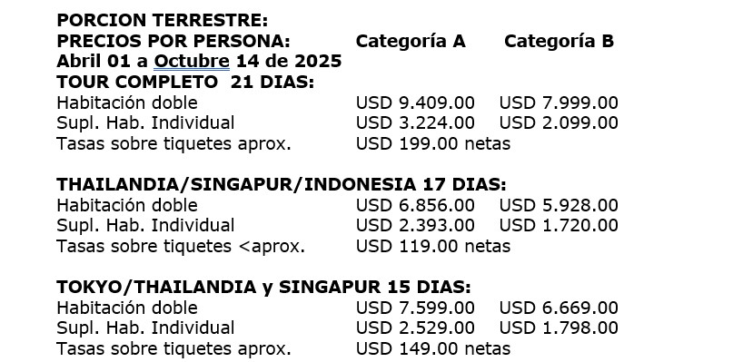 Los servicios en el Medio y Lejano Oriente manejan condiciones especiales de reservas y cancelaciones, los hoteles, guías y medios de transporte se contratan y se pagan con una anticipación de 45 días antes de la llegada de los pasajeros a destino. Posterior al pago NO SON REEMBOLSABLES por ningún motivo por lo que cualquier servicio que dentro de este margen de tiempo sea modificado, cancelado o no tomado no da derecho a ningún tipo de reembolso