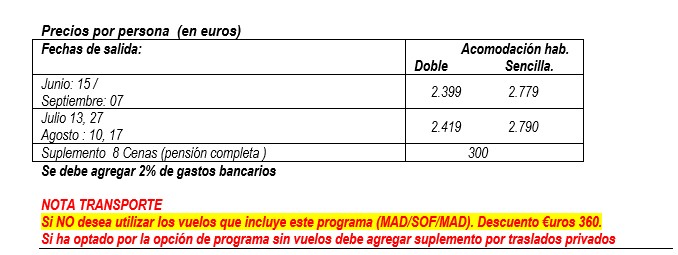 El precio normal incluye los tiquetes aéreos desde Madrid *se debe considerar llegar un dia antes a Madrid y salida un dia después de terminado el tour