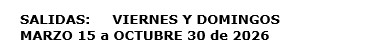 Salidas:  Marzo 15 a Octubre 30 de 2026