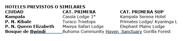 Recomendamos levantarse temprano y disfrutar del amanecer en este paraíso natural. Desayuno. A la hora prevista traslado al aeropuerto para tomar el vuelo con destino a Entebbe donde conectara con el vuelo de salida (posterior a las 17:00 hrs)….