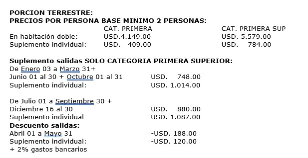 La organización de estos viajes combinados ha sido realizado por VIAJES CELTOUR operador mayorista con Registro Nacional de Turismo 3487, y/o sus operadores locales, se hace responsable ante los usuarios por la total prestación de servicios descritos en el presente folleto